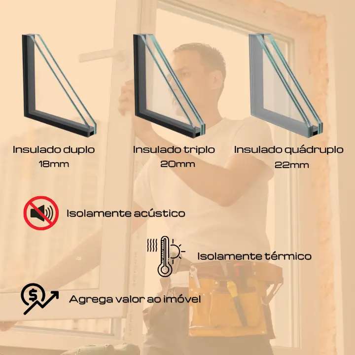 Janelas e portas com perfis especiais e vidros insulados ou laminados para reduzir ruídos e melhorar o isolamento térmico.